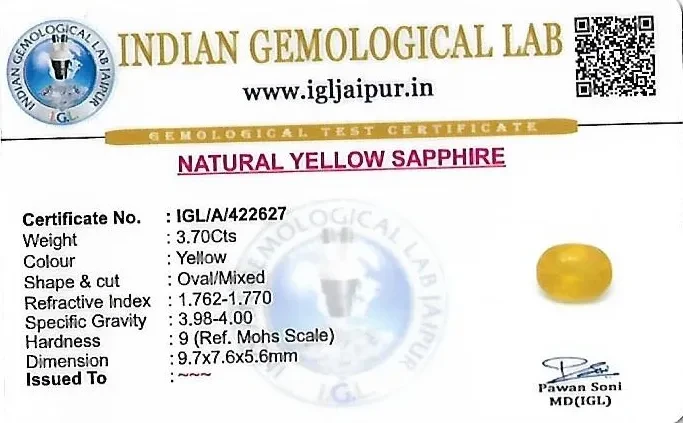 Natural Yellow Sapphire (Pushparag) weighing 3.7 carats In Oval from Thailand