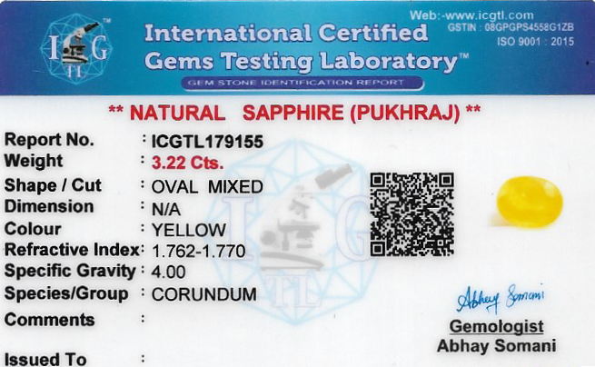 Yellow Sapphire (Pushparag) 11x7 MM 3.22 carats