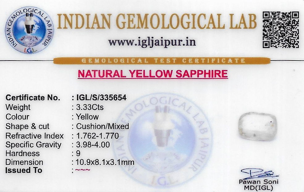 Natural Yellow Sapphire (Pushparag) weighing 3.33 carats In Cushion from Sri Lanka (Ceylon)