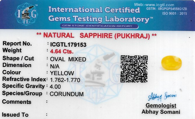 Yellow Sapphire (Pushparag) 11x8 MM 4.64 carats