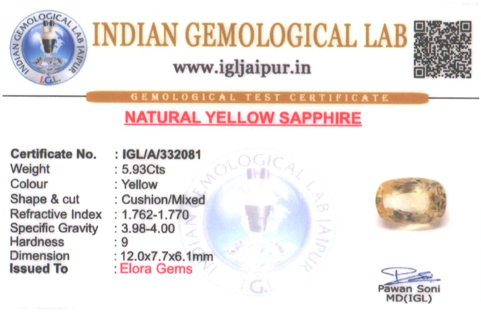 Natural Yellow Sapphire (Pushparag) 12x8 MM weighing - 5.93 carats in Cushion shape from Sri Lanka (Ceylon)