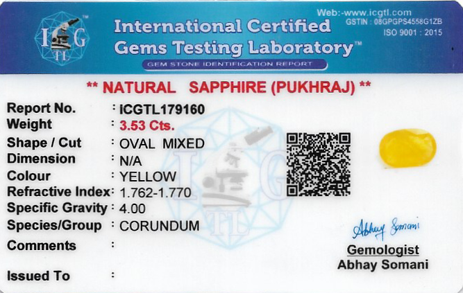 Yellow Sapphire (Pushparag) 13x9 MM 3.53 carats