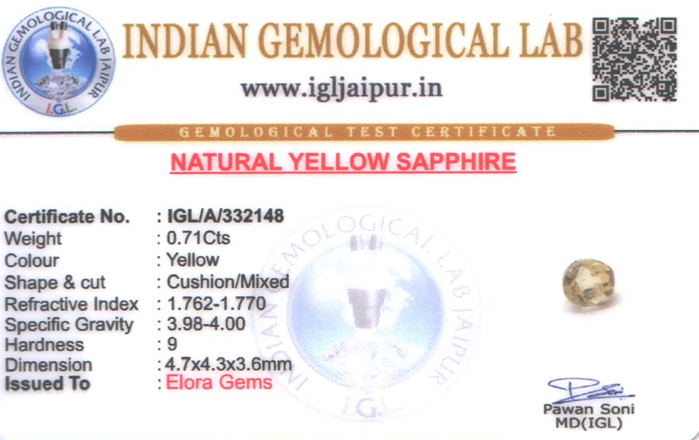 Natural Yellow Sapphire (Pushparag) weighing 0.71 carats In Cushion from Sri Lanka (Ceylon)