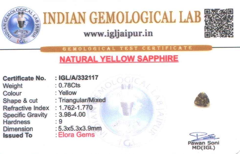 Natural Yellow Sapphire (Pushparag) weighing 0.78 carats In Triangular from Sri Lanka (Ceylon)