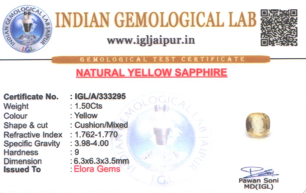 Natural Yellow Sapphire (Pushparag) weighing 1.5 carats In Cushion from Sri Lanka (Ceylon)