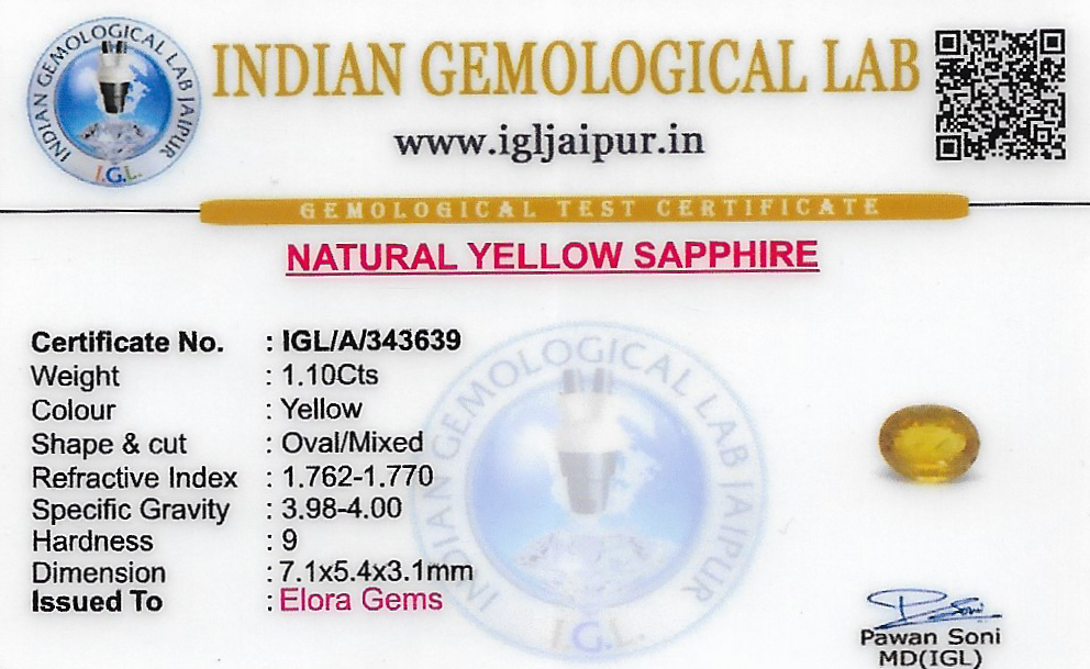 Natural Yellow Sapphire (Pushparag) weighing 1.1 carats In Oval from Thailand