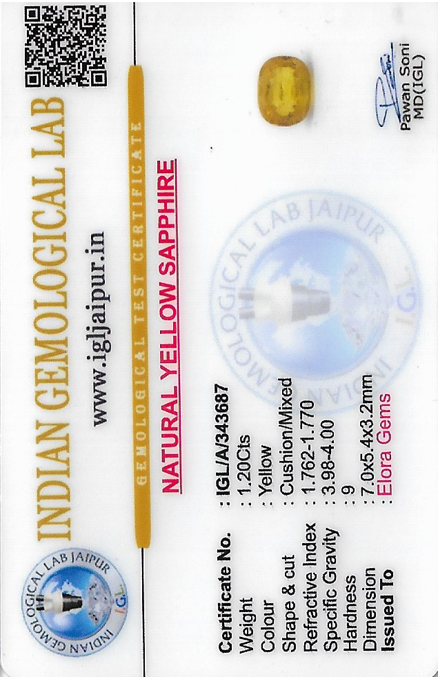 Natural Yellow Sapphire (Pushparag) weighing 1.2 carats In Cushion from Thailand