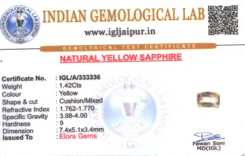 Natural Yellow Sapphire (Pushparag) weighing 1.42 carats In Cushion from Sri Lanka (Ceylon)