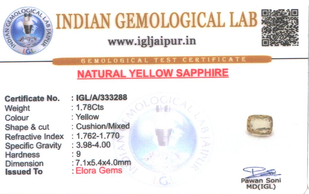 Natural Yellow Sapphire (Pushparag) weighing 1.78 carats In Cushion from Sri Lanka (Ceylon)