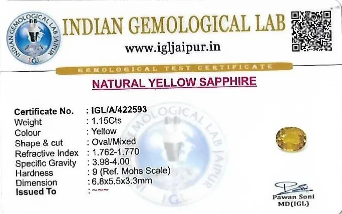 Natural Yellow Sapphire (Pushparag) weighing 1.15 carats In Oval from Thailand