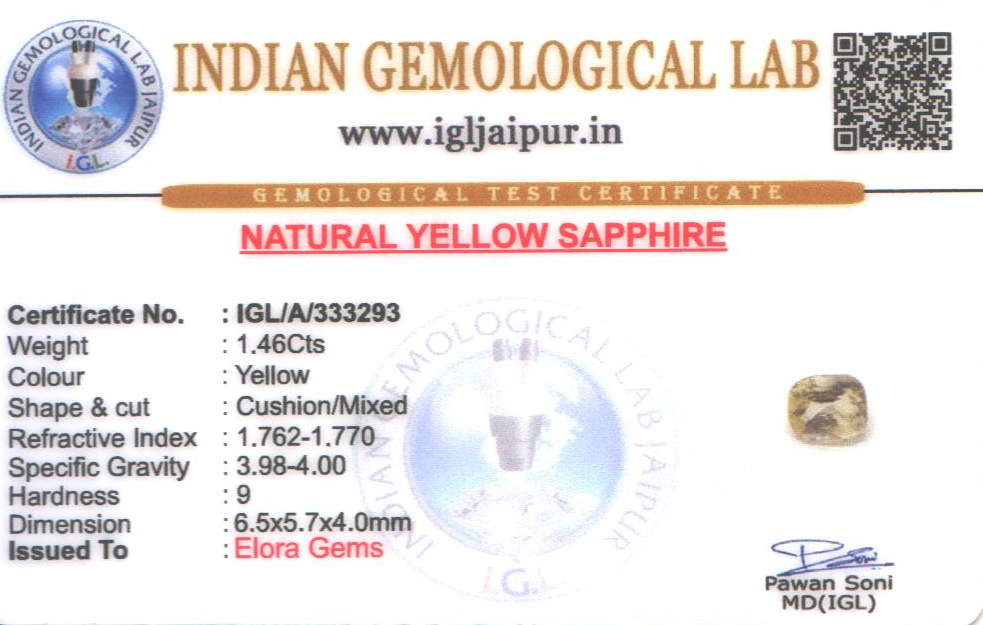 Natural Yellow Sapphire (Pushparag) weighing 1.46 carats In Cushion from Sri Lanka (Ceylon)