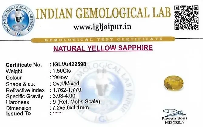 Natural Yellow Sapphire (Pushparag) weighing 1.5 carats In Oval from Thailand