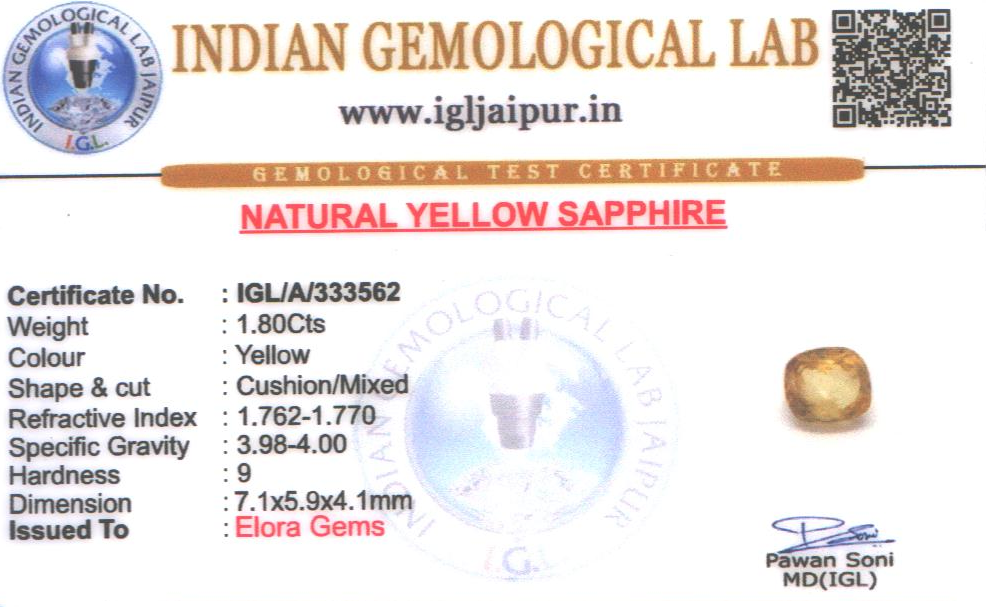 Natural Yellow Sapphire (Pushparag) weighing 1.8 carats In Cushion from Sri Lanka (Ceylon)