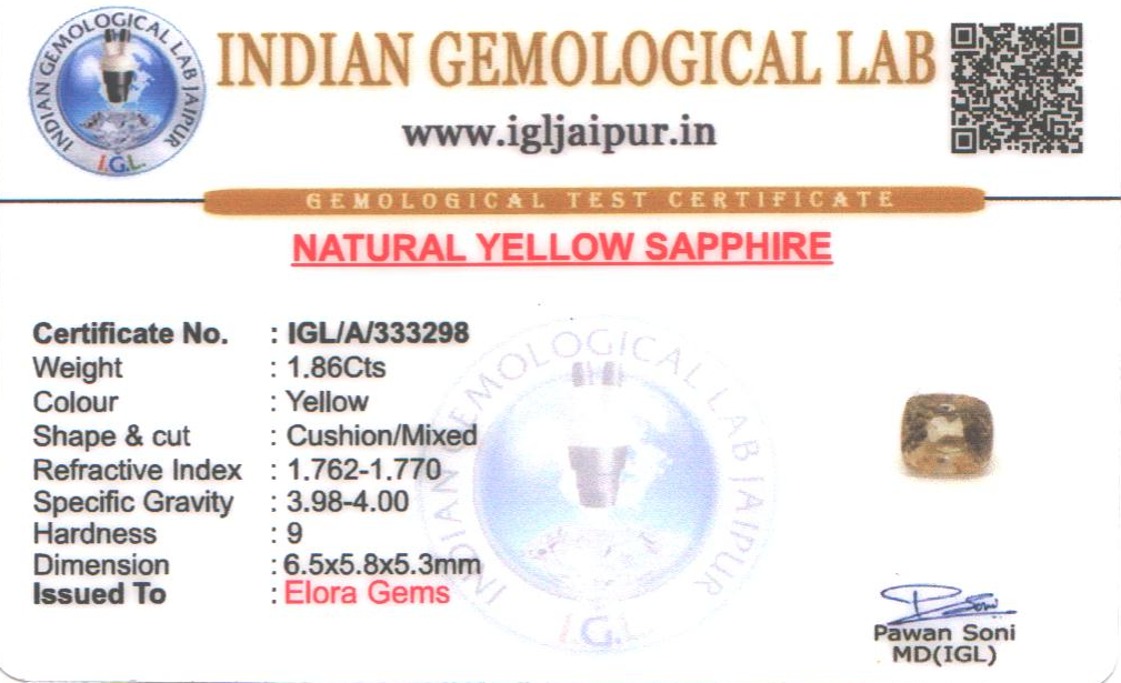 Natural Yellow Sapphire (Pushparag) weighing 1.86 carats In Cushion from Sri Lanka (Ceylon)