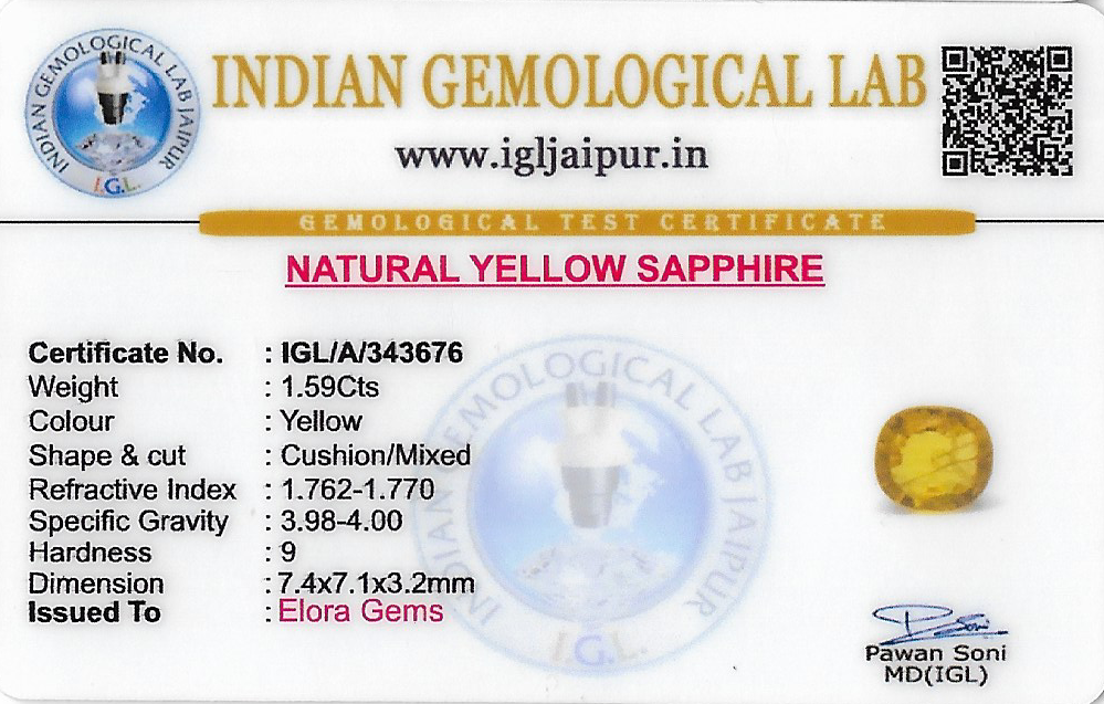 Natural Yellow Sapphire (Pushparag) weighing 1.59 carats In Cushion from Thailand