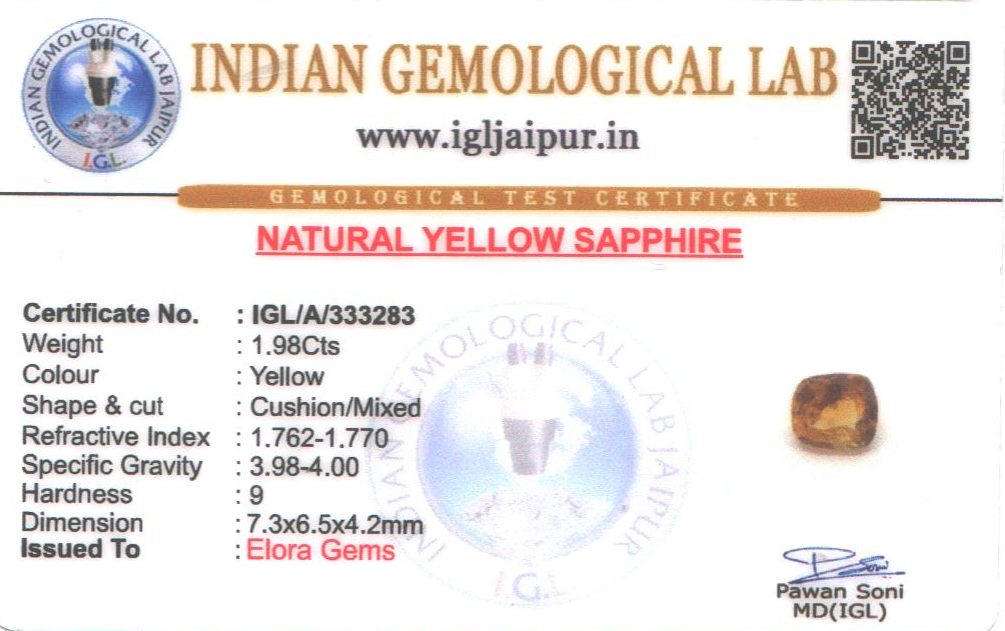 Natural Yellow Sapphire (Pushparag) weighing 1.98 carats In Cushion from Sri Lanka (Ceylon)