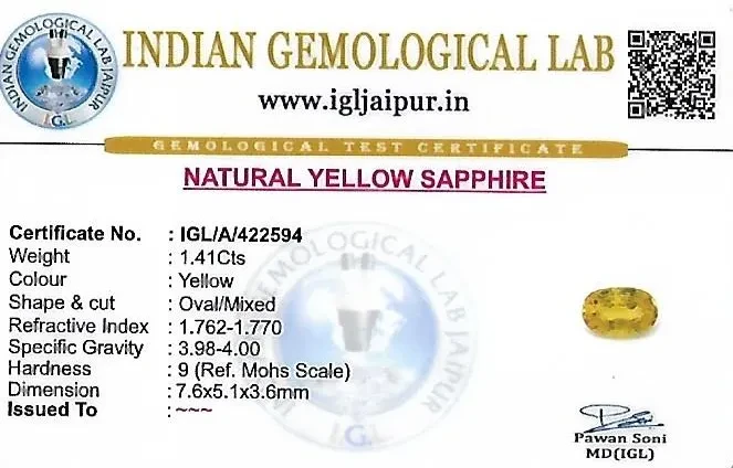 Natural Yellow Sapphire (Pushparag) weighing 1.41 carats In Oval from Thailand