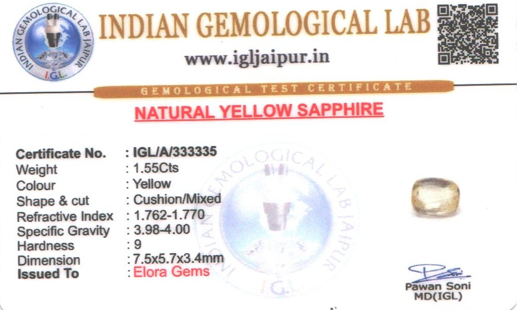 Natural Yellow Sapphire (Pushparag) weighing 1.55 carats In Cushion from Sri Lanka (Ceylon)