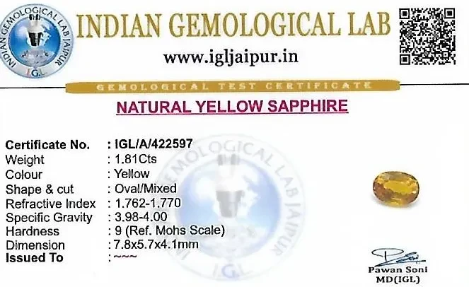 Natural Yellow Sapphire (Pushparag) weighing 1.81 carats In Oval from Thailand