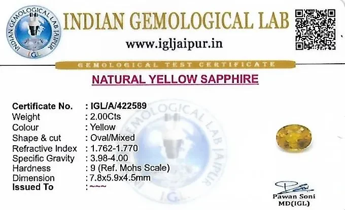 Natural Yellow Sapphire (Pushparag) weighing 2 carats In Oval from Thailand
