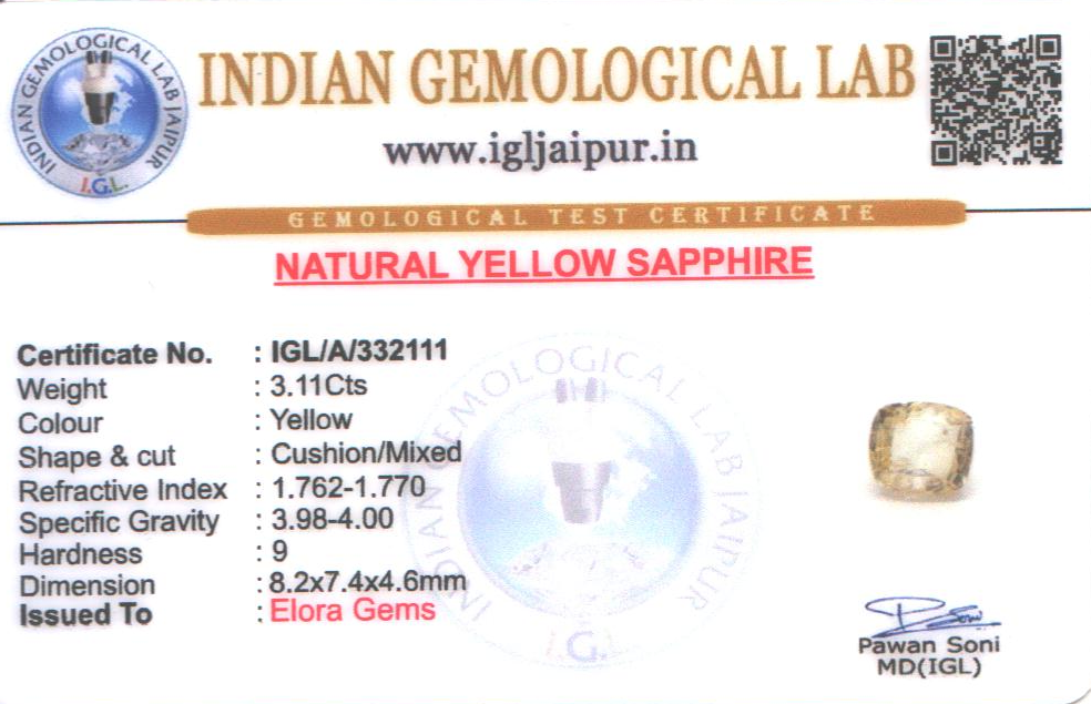 Natural Yellow Sapphire (Pushparag) weighing 3.11 carats In Cushion from Sri Lanka (Ceylon)