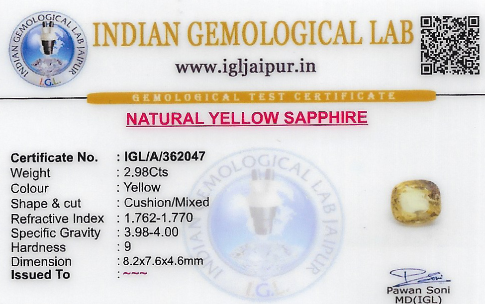 Natural Yellow Sapphire (Pushparag) weighing 2.98 carats In Cushion from Sri Lanka (Ceylon)
