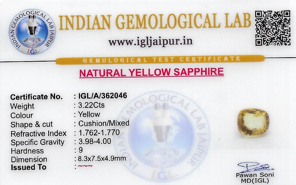 Natural Yellow Sapphire (Pushparag) weighing 3.22 carats In Cushion from Sri Lanka (Ceylon)
