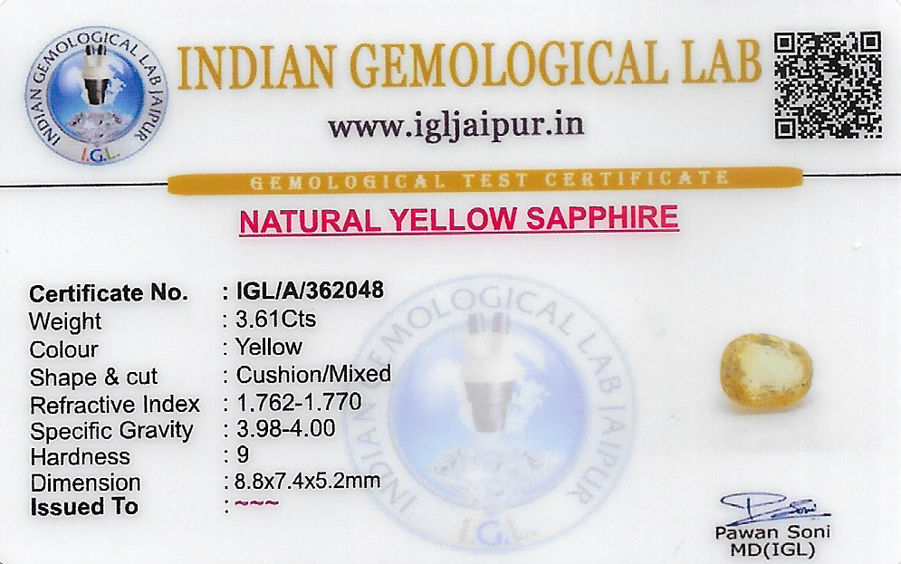 Natural Yellow Sapphire (Pushparag) weighing 3.61 carats In Cushion from Sri Lanka (Ceylon)